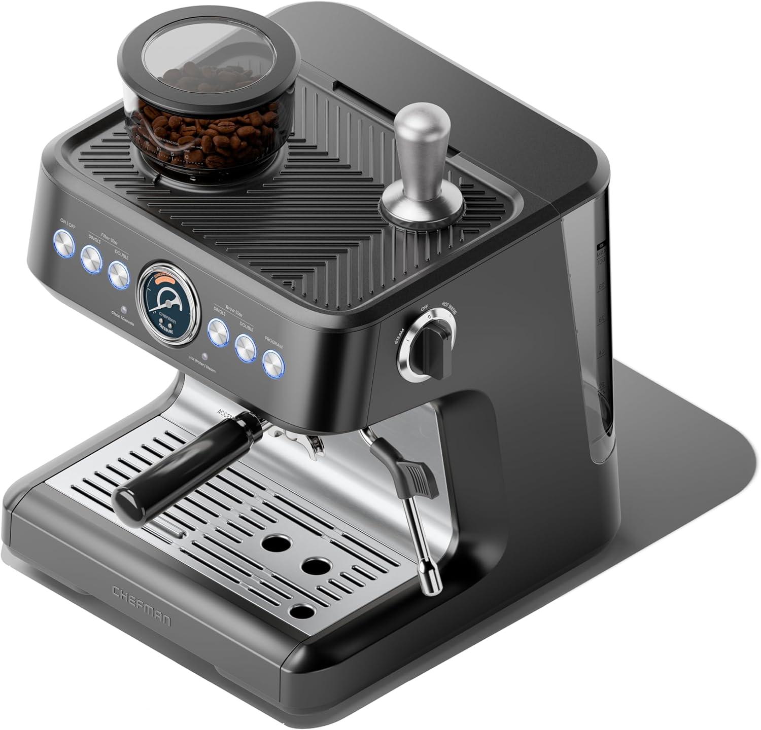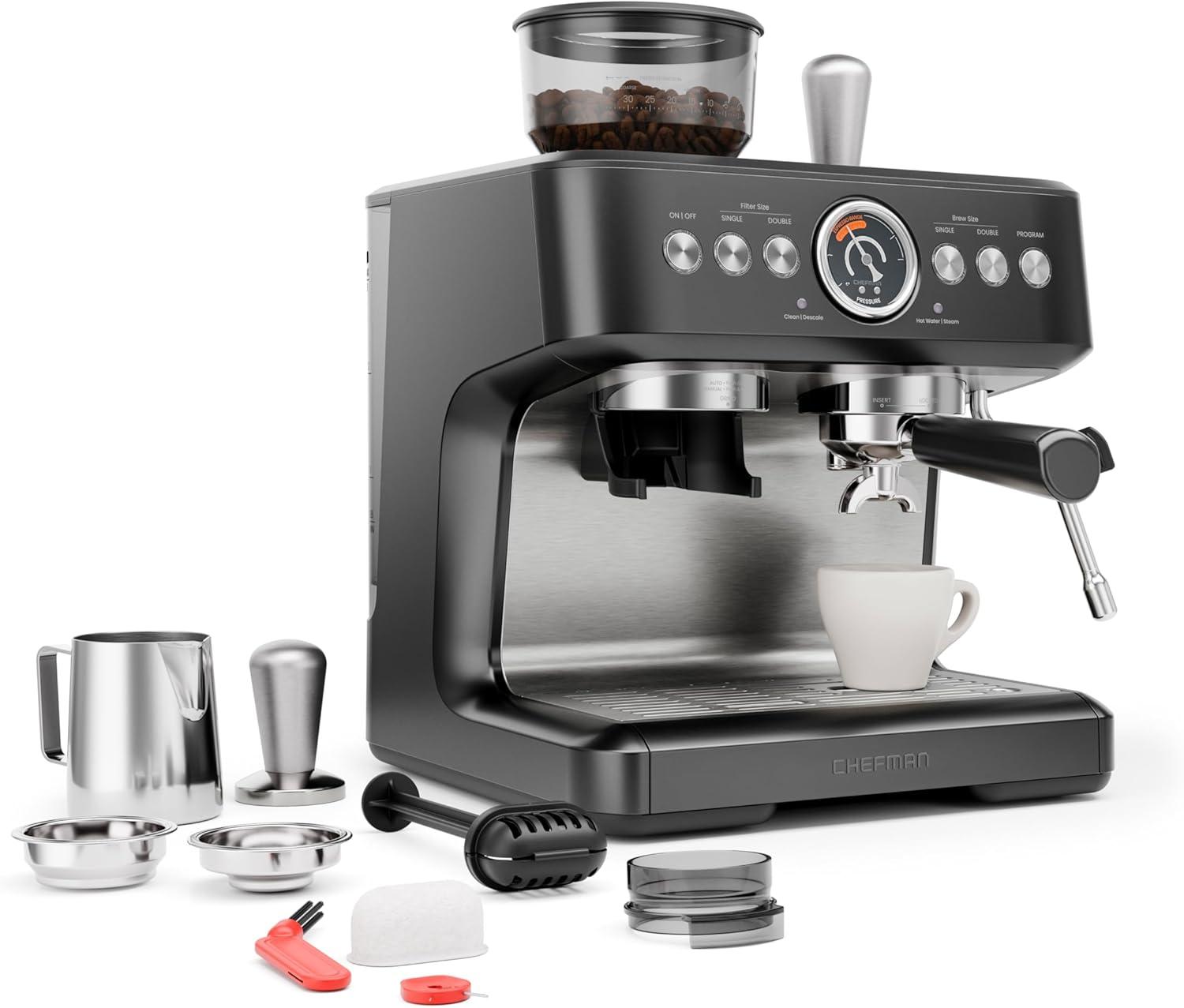 Enjoy the quality of your favorite café without the long lines or expensive daily expenses with the Chefman® Crema Deluxe™ Semi-Automatic Double Boiler Espresso Machine. Featuring a top-of-the-line double boiler and semi-automatic brewing, you can set and forget your espresso and start frothing milk while you wait. Your lattes, flat whites, cappuccinos, and more will come out silky smooth without having to wait for one function to finish! Combining a powerful 15-bar pump, a conical burr grinder, and a built-in steam wand, it is built top to bottom for barista-level brewing in the comfort of your own home. The Crema Deluxe’s grinder features 30 individual grind settings, adjustable brewing temperature and shot volume, and a pressure gauge, ensuring that your morning coffee comes out exactly how you like it There are preset buttons to grind for single- or double-shots of espresso, or you can dose manually for your preferred amount of ground espresso. The 3-liter water tank is fully removable to fill directly from the tap, and the drip tray has space for storage of the included accessories. Purchase includes a milk pitcher, stainless-steel tamper, single- and double-shot baskets, grind funnel, and cleaning tools. The Crema Deluxe is built for guess-free brewing and effortless customizability, so your espresso is perfected for your own taste. For information on how to use your product, scroll down for a PDF User Guide. 1500 Watts/120 Volts – RJ54-G-SS-D-BLK
