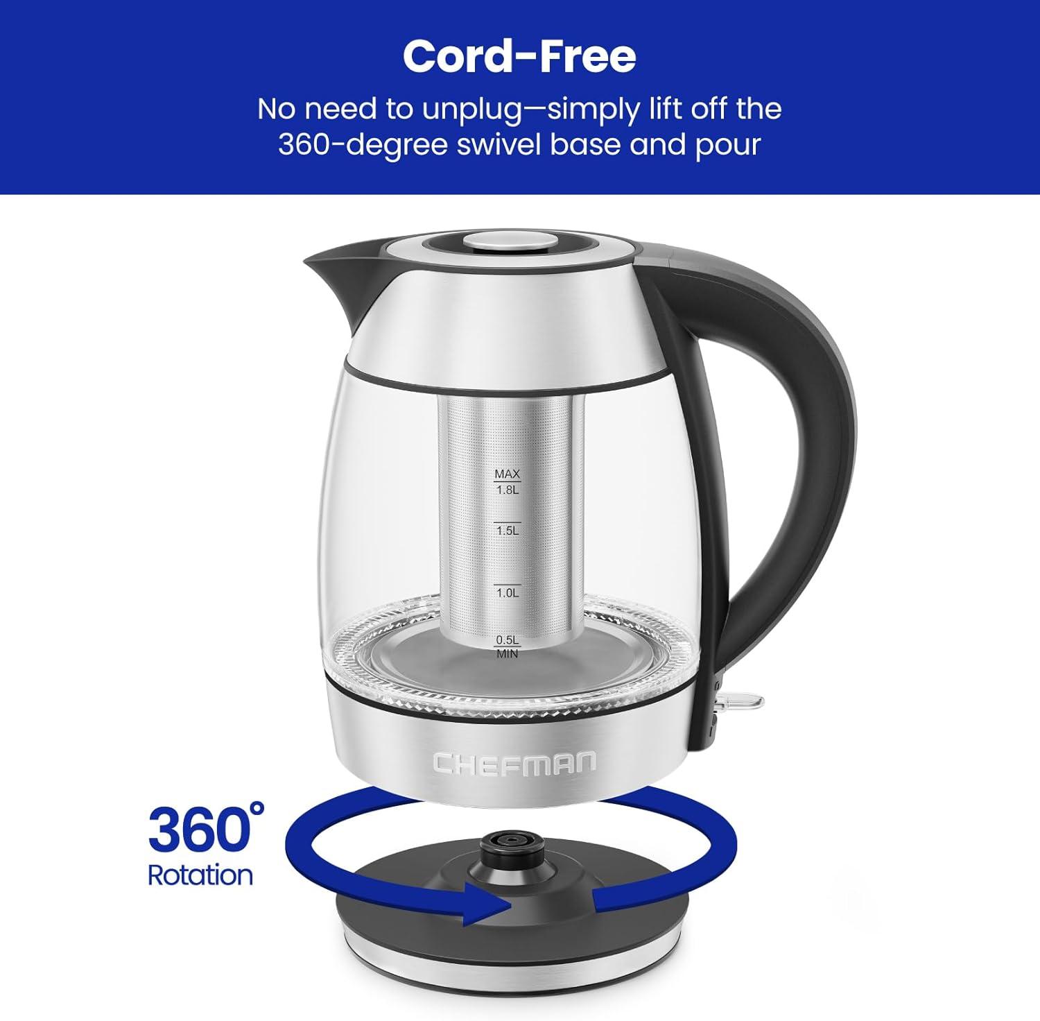 SWIFT AS LIGHTNING: Chefman Lightning electric tea kettles boil water 25% faster than lower-wattage Chefman electric kettles! Boil 2 cups of water in as little as 2 minutes to enjoy tea, hot chocolate, pour-over coffee, and other hot beverages faster than ever.